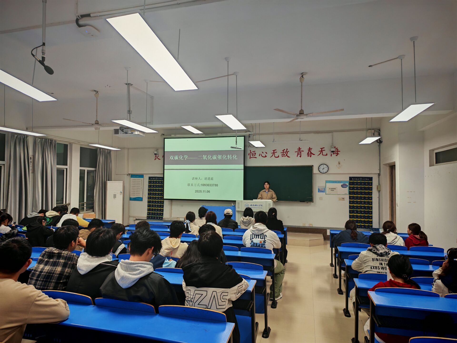本网讯 11月6日下午,化学与制药工程学院教师道逍遥博士在锦绣校区逸夫楼A306举行了一场题为“双碳化学——二氧化碳催化转化”的学术报告。化学等相关专业学生聆听了报告。